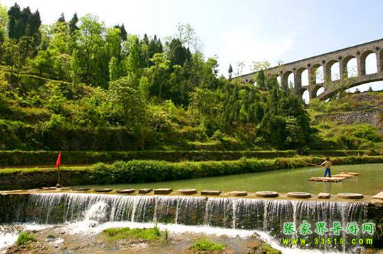 寨前阡陌縱橫,溪流交錯(cuò),九曲迂回,水邊是排排水、石碾,水里是整塊整塊的天然青巖板,出水為洲,入水為瀑,并形成許多奇特階梯瀑,水上是一道道巖板堰,堰上是一道道形態(tài)各異的跳巖,水溝上橫著塊塊巨大的巖板橋……山水田園與水、水碾、巖板堰、巖板橋、跳巖相互輝映,構(gòu)成一幅幅絕妙卷。