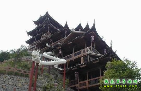 望郎峰北隔幽谷西望,一巨大石壁高聳云端,面寬達(dá)百米。因受風(fēng)雨剝蝕,流痕結(jié)網(wǎng),與頂端參差不齊的峰石結(jié)合,構(gòu)成錯(cuò)落有致的一幅壁畫:林木掩映的圍墻之內(nèi),池塘水榭,墻垣瓦梁,依稀可見。還有幾座吊腳樓,幾座寺廟,其間仿佛有人來(lái)往。雨天,云霧飄拂,樓臺(tái)墻垣若隱若現(xiàn),儼然海市蜃樓。