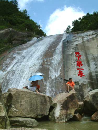 水簾洞瀑布源頭,在紫蓋峰的泉水。三支泉水匯集一起,流入水簾洞上方谷地。谷地闊三丈,原是梁朝的九位真人白日飛升的棲息之地,后建造九仙觀。九仙觀附近有太陽(yáng)泉、洗心泉、洞真源、仙人池等。相傳泉水深不可測(cè)。泉水從石壁上飛流直瀉,發(fā)出雷鳴般的聲音,聲傳十里。明朝張居正游此地后說(shuō):“瀑泉灑落,水簾數(shù)疊,掛于云際,垂如貫珠,霏如削玉”。確實(shí),它從絕壁上噴瀉下來(lái),寬達(dá)三太,高五十余米,瀉珠濺玉,仿佛一幅巨大的白布簾,在石壁當(dāng)中被亂石嶙巖擋住,然后再?gòu)氖p里屈曲折射,跳躍出來(lái),滿谷水花四濺,閃爍著晶瑩奪目的光彩。水簾絕壁下的碧潭,天上的云彩和兩邊的蒼翠的山巒,構(gòu)成一幅美麗的山水。明朝張居正作《水簾洞》一贊道:“誤疑瀛海翻瓊浪,莫擬銀河倒碧流;自是湘妃深隱處,水晶簾掛五去頭”。這首詩(shī)可說(shuō)是寫出了水簾洞的光、聲、影三絕的奇景了。