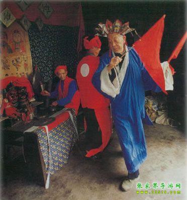 儺戲在湘西土家族地區(qū)也稱儺堂戲、儺神戲,它與土家族原始巫教、巫術(shù)的關(guān)系極為密切。土家族先民信奉的神有儺神、八部大神、土地神等,作為一種宗教活動,這種原始信仰與社會生產(chǎn)活動、文娛活動及民族習(xí)俗是融為一體的,因此儺戲最先的“沖儺還原”帶有明顯迷信色彩,土家族群眾中有“一儺沖百鬼,一愿了千神”的說法,湘西土家族人干脆叫它為“神戲”。湘西土家族儺戲的發(fā)展過程大體是儺、儺舞、儺儀然后才產(chǎn)生儺戲。儺舞源于久遠的蒙昧?xí)r期,土家先民們在同大自然作斗爭、同毒蟲猛獸作斗爭,便產(chǎn)生了化裝護面、在鼓樂聲中奔騰呼號、沖殺跳躍的原始儺舞,其所模擬的鳥雀舞、猿猴舞、熊舞等頗為壯觀。儺舞與儺這種驅(qū)鬼消災(zāi)的祭祀儀式結(jié)合后,增加了祈求人獸平安、五谷豐登、緬懷祖先、勸人去惡從善、以及傳播生產(chǎn)知識等內(nèi)容,這就逐漸形成了兼?zhèn)潢U弘教義及娛樂性質(zhì)的祭祀風(fēng)俗歌舞。[2]土家族儺戲就是在此基礎(chǔ)上發(fā)展起來的。部分土家族學(xué)者認為土家族儺戲的遠源可以追溯到戰(zhàn)國時代的《九歌》,《九歌》是土家族儺戲的雛形,他們的依據(jù)是當(dāng)時楚國的沅湘流域,人們“信巫鬼、重淫祀”(《漢書·地理志》),從而使得“陰陽人鬼之間,又或不能無褻慢淫荒之雜”(宋代朱熹《楚辭集注》)。屈原正是加工整理了這一類“鄙陋”之詞,才創(chuàng)作出《九歌》、《天問》等名篇。也有部分學(xué)者不贊同這種論點,他們認為土家族儺在宋代還停留在儺祭和儺舞階段,最遲到明代,土家族儺才發(fā)展成為儺戲[3]。嘉靖《常德府志》記載:“歲除,歲將盡數(shù)日,鄉(xiāng)村多用巫師,朱裳鬼面,鑼鼓喧舞竟夜,名曰還儺。”文中未點明“儺戲”二字,但卻使用了“還儺”一詞,這與今天民間對儺戲的稱呼相似。又據(jù)清乾隆《永順縣志》載:“永俗酬神,必延辰郡巫師唱演儺戲,……至晚,演儺戲。敲鑼擊鼓,人各紙面一,有女裝者,曰孟姜女;男扮者,曰范七郎。”在土家族儺戲中,孟姜女傳說故事占著非常重要的地位。在湘西土家族地區(qū),儺戲一般有二十四正戲,即二十四戲神。每次儺儀結(jié)束時,巫師要用香火在黃裱紙上燒二十四個洞,以表示奠祭二十四戲神。民間有諺語:“儺神菩薩不識字,只要二十四個圈圈滿。”在二十四儺神中,被稱為勾愿神的姜女、范郎是還儺愿時非常重要的兩位神靈。在儺戲中,《孟姜女》是整場的高潮,平時,儺戲唱完后,由沒下裝的孟姜女、范郎去向主人家及觀眾“拜臺”,以示“了愿”。清代中期以后,儺戲吸取了花燈、陽戲、高腔等其他地方戲劇劇種的唱腔和劇目,逐漸變得日益成熟。我們仔細查看了全國371個劇種,發(fā)現(xiàn)儺戲、花燈戲有著相同的班社,也就是說一個演出班社可以演出儺戲、花燈戲兩個劇種。這段時期,儺戲已作為獨立戲劇劇種參加演出。由于儺戲是由巫儺法事演變而成的戲劇形式,經(jīng)歷著巫儺法事(驅(qū)鬼祭祀)、儺壇上戲和儺堂正戲的發(fā)展過程。