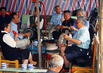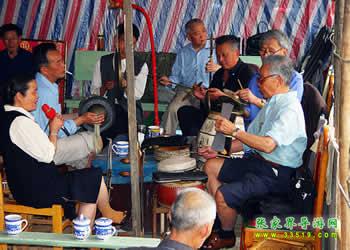圍鼓(含嗩吶)。又稱(chēng)打鎦子、打排鼓,是民間紅白會(huì)中不可缺少的樂(lè)器。一般7人演奏,樂(lè)器有一鼓、一大鑼、一公鑼、兩副鈸、兩嗩吶。其詞曲紅白會(huì)通用,以鼓和嗩吶上系紅、白布為分別標(biāo)記(結(jié)婚不打四字鈸曲)。史傳的圍鼓詞有《撩子》、《火鋪》等,《撩子》分《一二三》、《閃翅》、《堆羅漢》、《反落花》等十章,《火鋪》也分《三槍》、《四進(jìn)門(mén)》、《八哥洗澡》、《蓮魚(yú)吐絲》等十章,嗩吶詞有《八十正宮》調(diào)等。在農(nóng)村,圍鼓是最普及的樂(lè)器,每逢紅白喜事都有圍鼓和嗩吶表演。