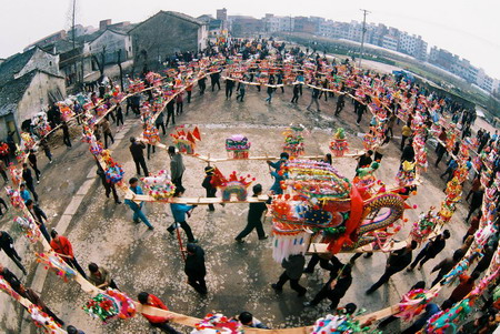 龍舞是中國民間體育藝術(shù)。大庸境內(nèi)的板凳龍是 別具一格的龍舞形式。尤其桑植縣白族人民,對舞板 凳龍有著特殊偏愛。 白族同胞耍板凳龍,相傳起于漢代,由白族先民 “舞龍求雨”的宗教活動演變而來。 板凳龍有兩種樣式。一種是簡式板凳龍,由二個 舉長凳為頭,一人在后選適當(dāng)“舞臺”表演;另一種 是“篾扎板凳龍”,即用竹篾扎成龍形置于板凳之上 ,以木腳示龍爪,造型美觀,逼真。耍板凳龍又分兩 種舞式,一為獨(dú)凳龍,一為九節(jié)龍(九張板凳相接)。 舞板凳龍動作有“二龍搶珠”、“黃龍穿花”、“二 龍戲水”、“金蟬脫殼”、“黃龍盤身”等。永順、 慈利還流行草把龍,其龍耳稻草扎成。龍舞還有“干 龍”、“濕龍”之分,“干龍”多為娛樂,“濕龍” 則為求雨。“龍”到之處,百姓必潑水助威,舞者一 身透濕,盛為熱烈歡快。
