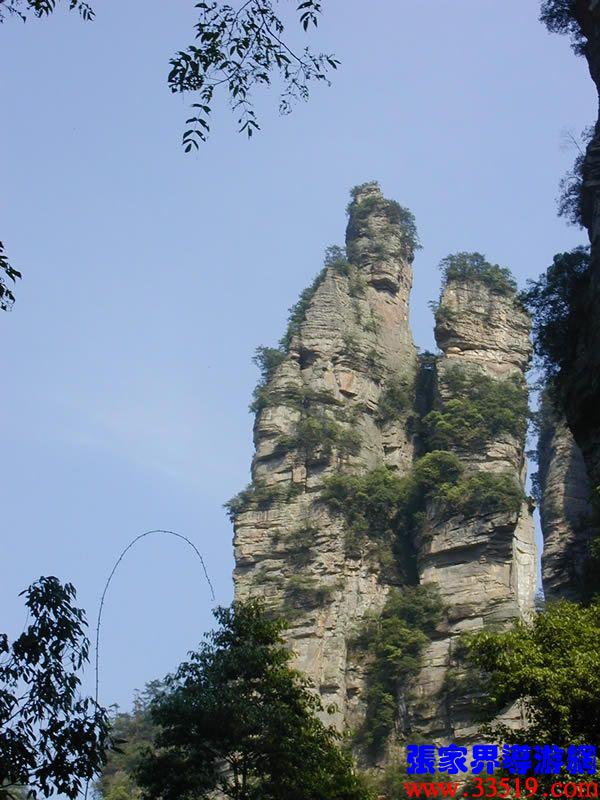 (花果山、水簾洞)孫悟空的花果山水簾洞到了。并不是張家界人過于牽強,胡亂把西游記的事兒往這兒湊,實在是巧合,《西游記》劇組的導游楊潔及唐僧、豬八戒、孫猴子、沙和尚等飾演者,一見到這地方就十分肯定地說:外景地選遍全國,只有張家界才真正是《西游記》筆下的神仙妖魔世界。大家順著我的指向往前看,左前方是帶著僧帽,披著袈裟,嘴中念念有詞的唐僧,緊跟在他后面的那座黑乎乎的石峰當然就是沙和尚了;神通廣大的孫猴子半蹲在唐僧后側手搭涼篷,正在觀察敵情呢;豬八戒哪去了?不用說,不是貪吃貪睡,就是偷偷找小女子搭訕去了,花心去了。