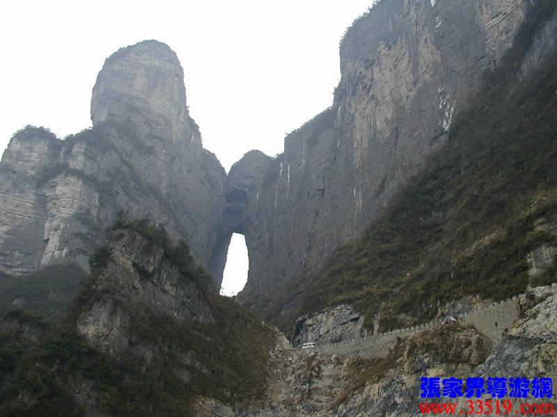 (俯視天門)站在這里可以俯視面向北面的天門洞,以及天門山公司正在修建的通天大道。1999年11月世飛賽期間,中央電視臺(tái)6號(hào)機(jī)組正是在這里拍攝飛機(jī)穿越天門驚人場(chǎng)面的。這兒距天門洞垂直高度200多米。