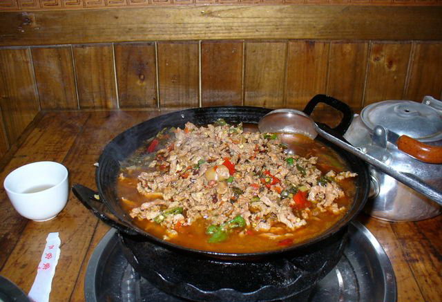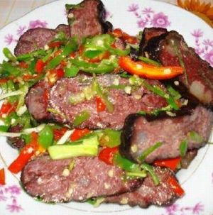 介紹: 血豆腐,就是將豆腐和豬血、豬肉及花椒、辣椒等佐料拌成泥狀,捋成卵形,以竹篩置火炕上,煙熏烤成臘黃,吃起來耐嚼味香,是土家特色菜,當(dāng)?shù)厝顺R云湎戮啤?在張家界的飯館里很難吃到正宗的土家特色菜,可以去做土味的特色餐館去解解饞。但是最正宗還是鄉(xiāng)下人家家里自己熏的,那才叫一個(gè)好吃?。?!
