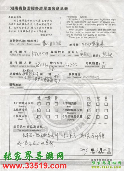 2009年7月14日蘇州尤女士一行41人質(zhì)量接待反饋單: