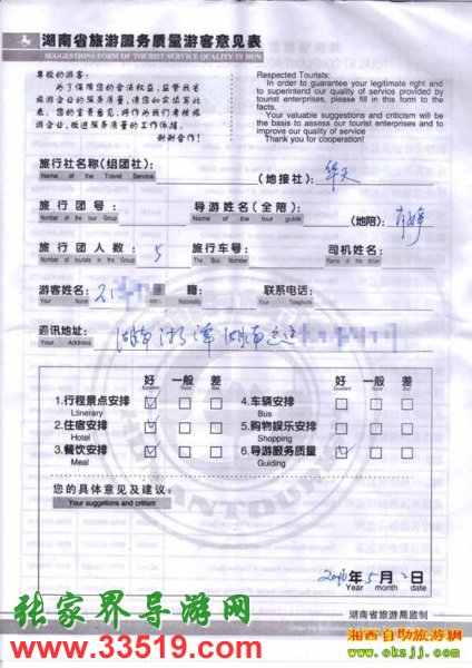 2010年5月3號湘潭王先生一行5位旅游質(zhì)量反饋