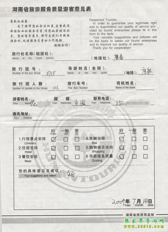 2009年陳女士一行10質量接待反饋單:
