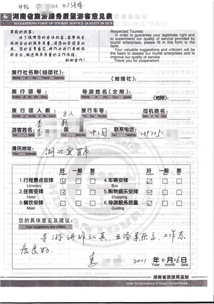 2011年4月26日李先生一行8人旅游質(zhì)量反饋:導(dǎo)游講解認(rèn)真,業(yè)務(wù)素質(zhì)好